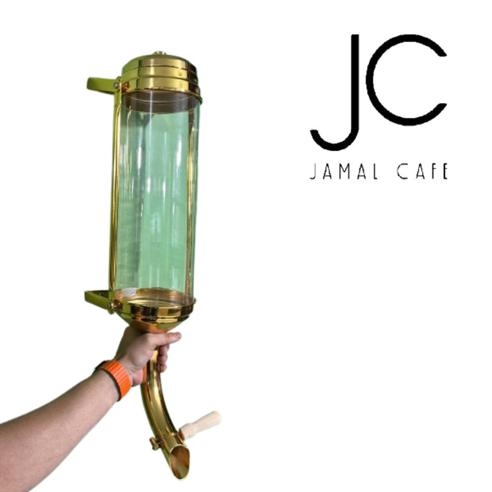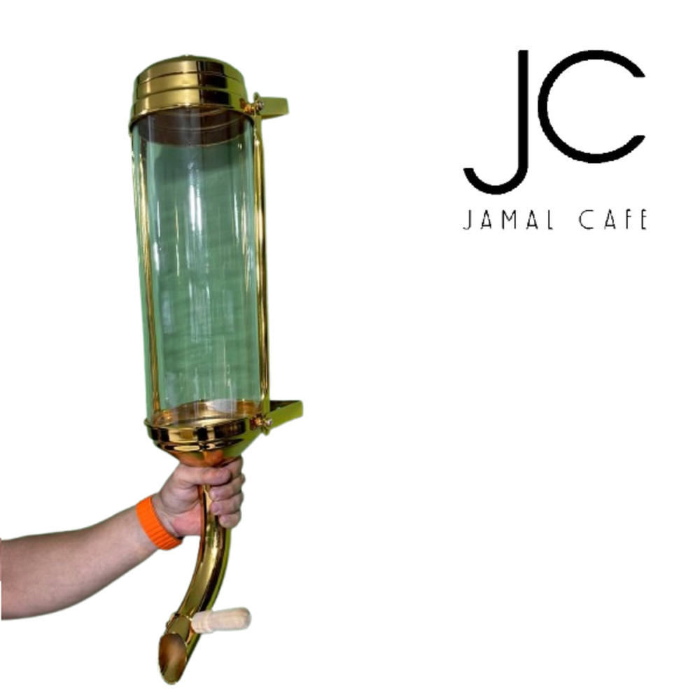سیلو قهوه استوانهای شیشه ایی طلایی جمال کافه ترکیبی از طراحی لوکس و عملکرد حرفهای است. این محصول دارای مخزن شیشهای شفاف است که بهوسیلهی قاب فلزی طلایی از دو طرف نگه داشته میشود و علاوه بر جلوهای زیبا، امکان مشاهده میزان قهوه درون مخزن را نیز فراهم میکند.
